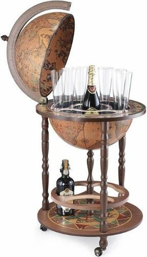 Wat een schitterende wereldbol voor het opbergen van flessen, glazen of karaffen! Op de wereldbol zijn mooie versieringen aangebracht van dieren, schepen en gebouwen. Doot het praktische handvat is de globe makkelijk te openen. In de globebar is ruimte voor ongeveer 4 flessen en 10 glazen, maar ook onderop de globebar kunt u meerdere flessen kwijt. Bezorg uw gasten een onvergetelijk tijd door ze een drankje te serveren uit deze mooie houten globebar.