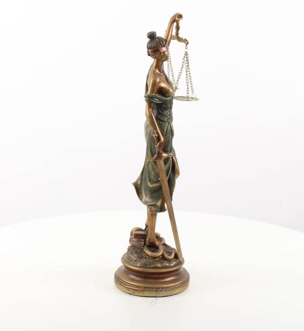 Prachtig gedetailleerd beeld van Vrouwe Justitia. Het beeld is gemaakt van resin en staat op een goudkleurige sokkel.