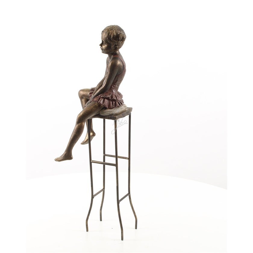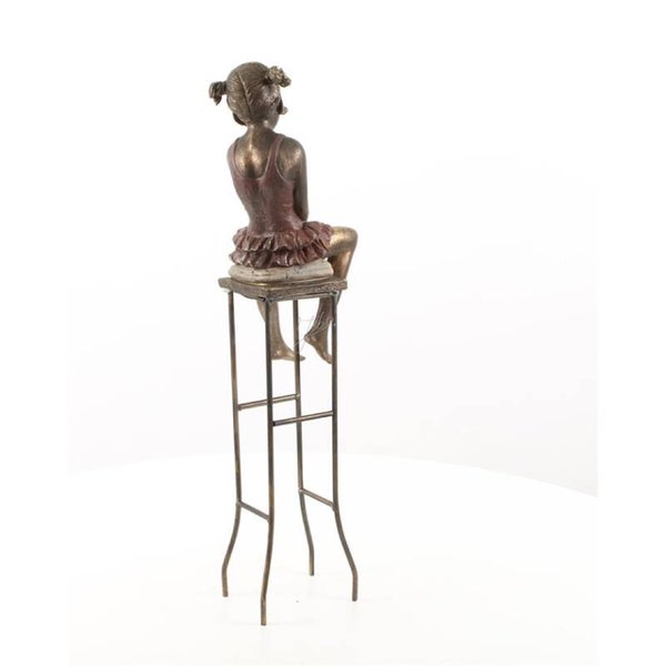 Mooi beeldje van een meisje op een kruk. Het beeldje is zeer gedetailleerd uitgevoerd en gemaakt van resin.Afmetingen: 18x17,2x55cm (lxbxh)