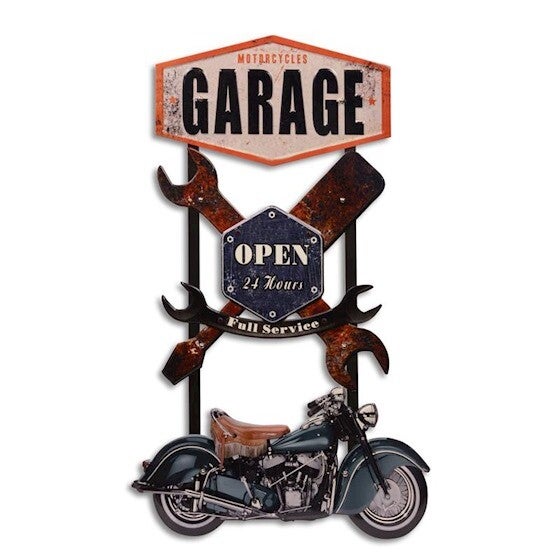 Leuk groot tekstbord gemaakt van tin met de tekst: "Motorcycle garage".