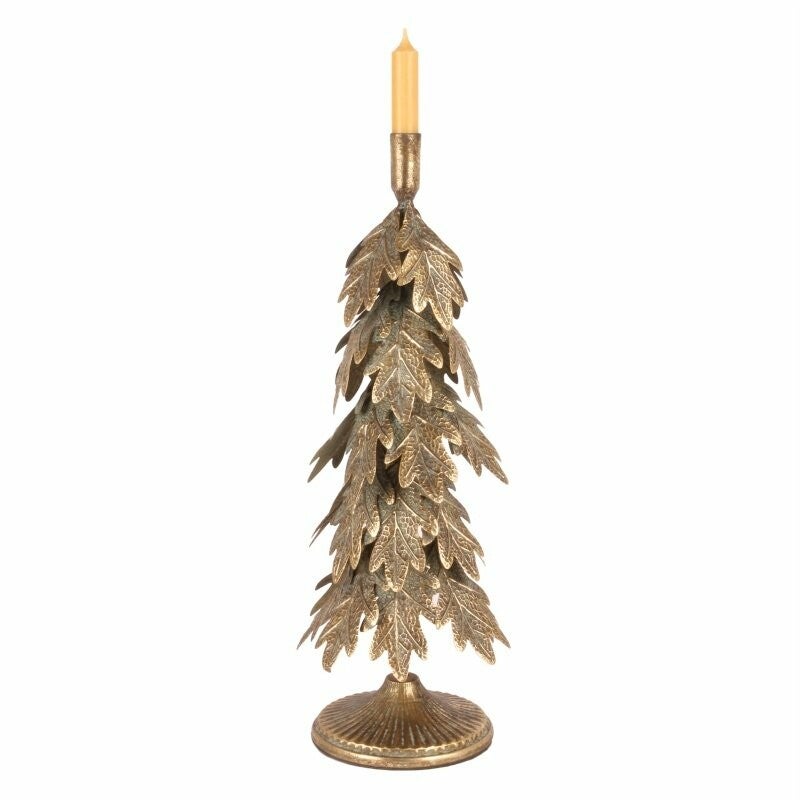 Prachtige grote kandelaar in een mooie boomvorm. Hij leent zich uitstekend om te decoreren in winter- of kerststijl. De kandelaar is gemaakt van ijzer met een gouden coating. De voet heeft een diameter van 14 cm.