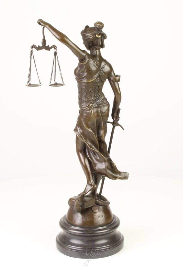 Mooi bronzen beeld van vrouw Justitia. Het beeld is met de hand gemaakt en zeer gedetailleerd uitgevoerd.